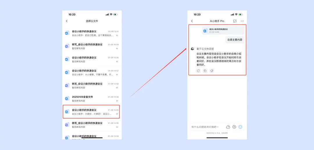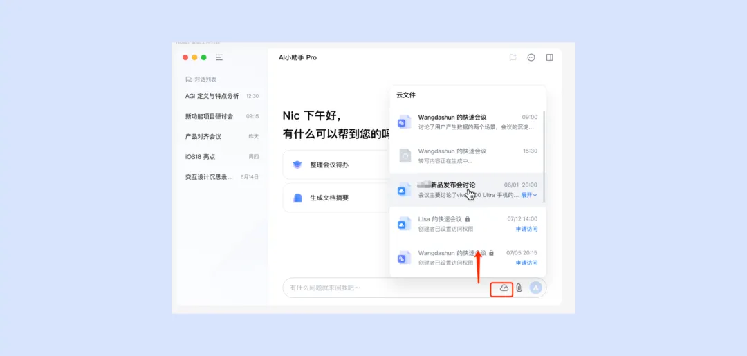 在聊天区单击云文件并选择历史会议,针对本次会议提问内容或生成会议总结,小助手将根据本次内容回答(如果没有权限需要申请权限)。