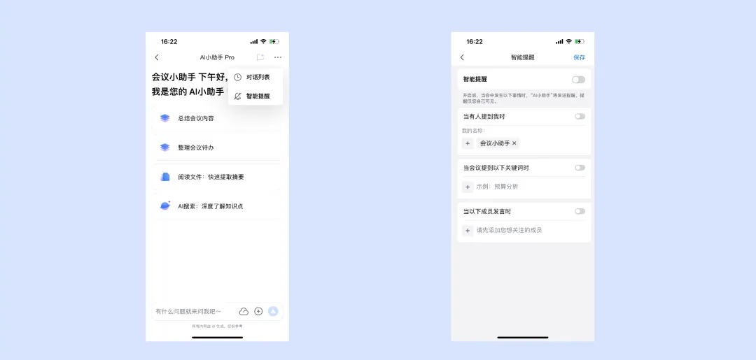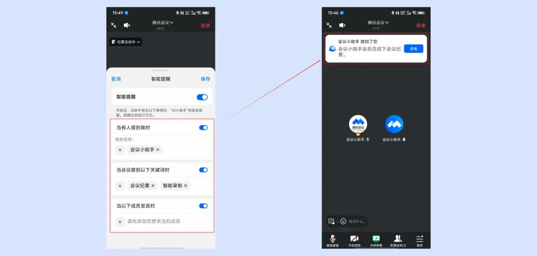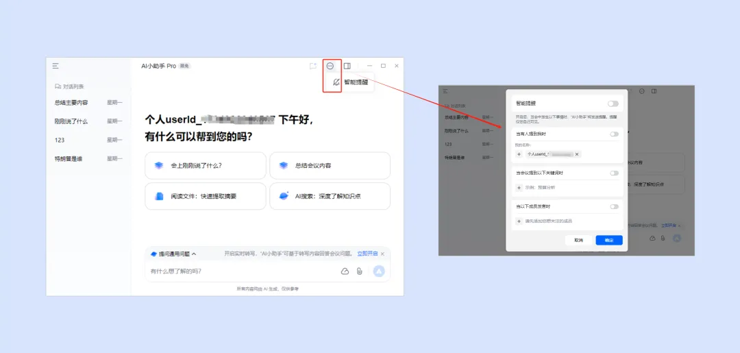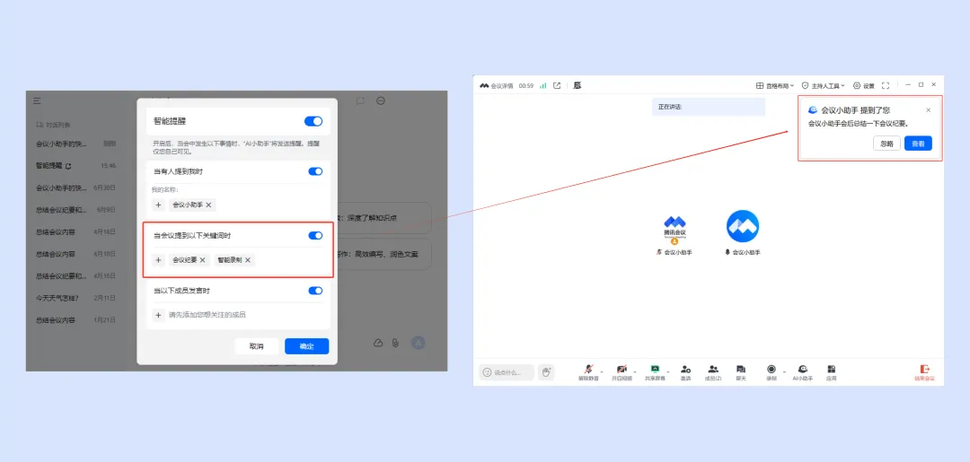 1.开启智能提醒后,当会中发生“当有人提到我时、当会议提到关键词时、当以下成员发言时”,AI 小助手将发送提醒,该提醒仅您自己可见。