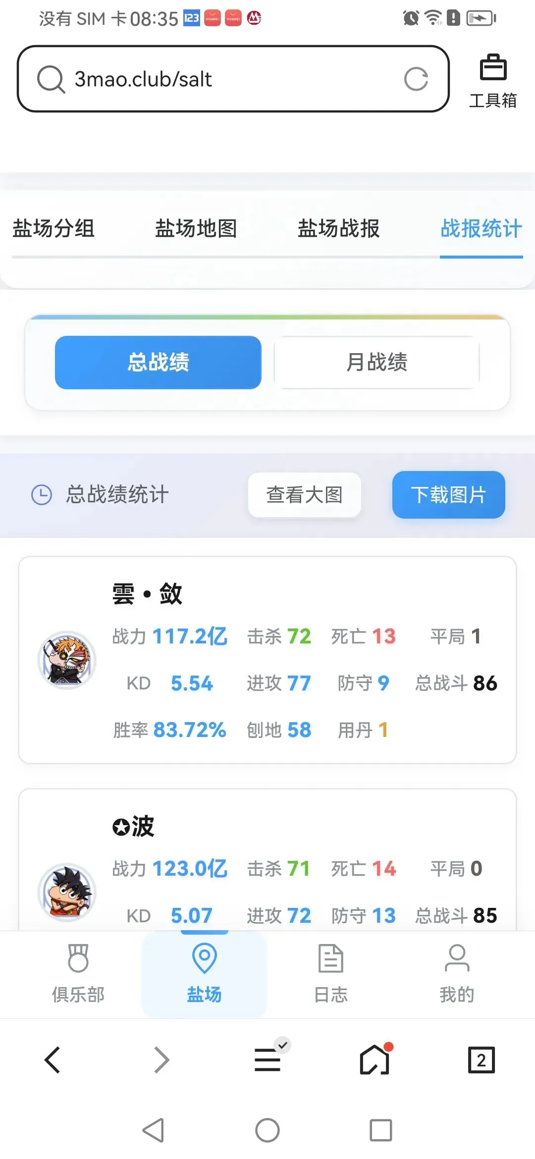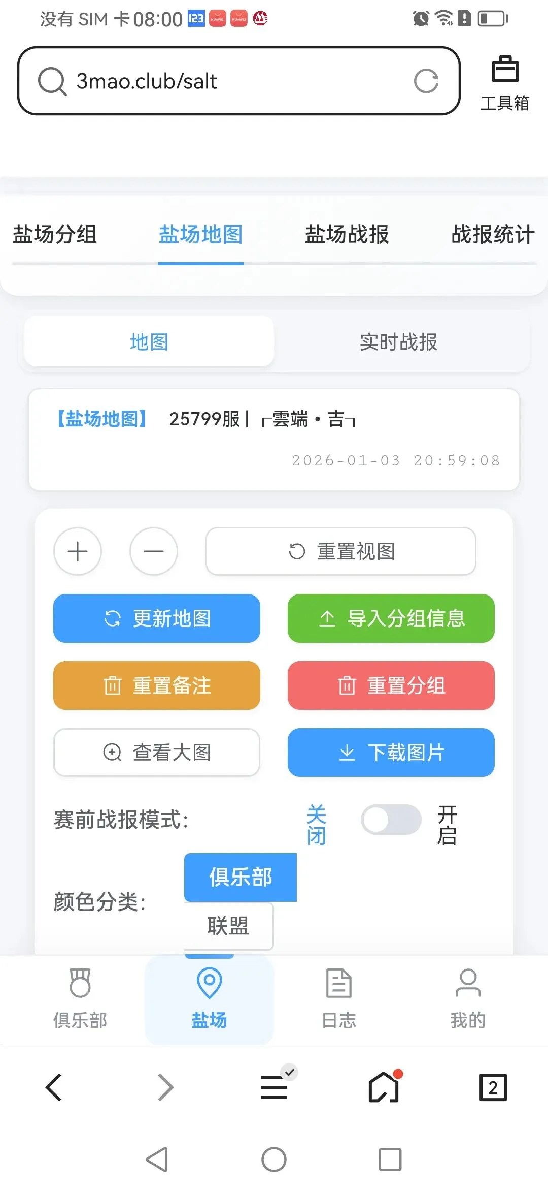 功能2:盐场地图 实时战报(更新地图,7.55分钟获取,导入分组信息查看图片,下载)(实时战报可获取全场20家的战绩跟总战绩,周赛需8.00-9.00之间获取,月赛需8.00-9.30之间获取)