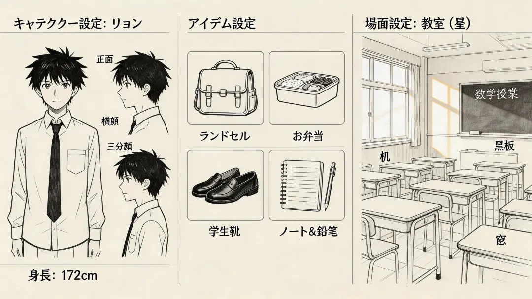 3. 风格统一:制作人物设定图和场景设定图,标注关键细节(如人物服装的颜色、场景的光影方向),作为后续AI生成的参考标准;