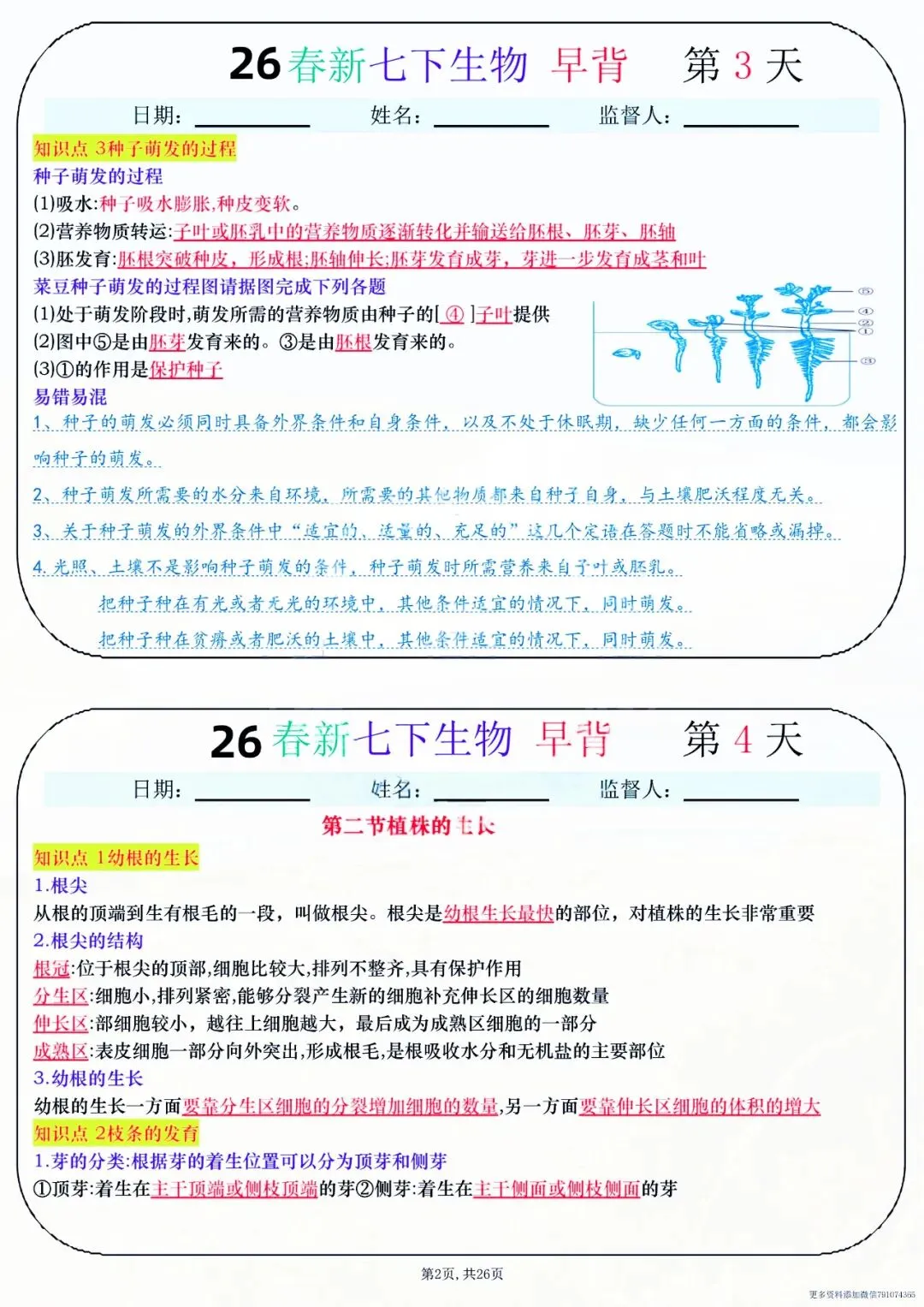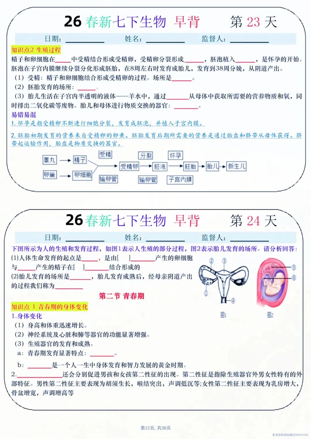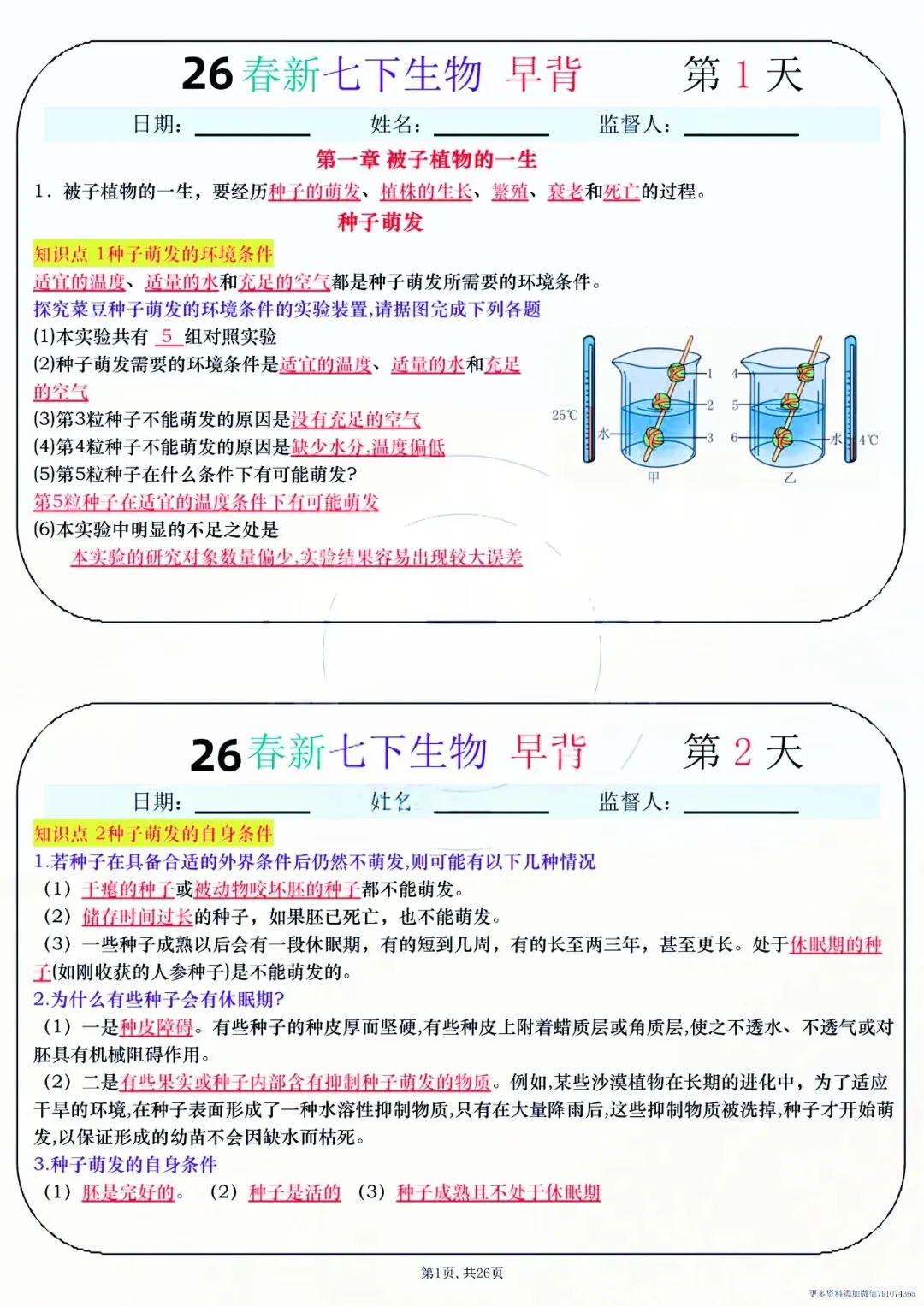 今天老师给大家整理了:七年级下册生物 默写小纸条背诵版 电子版可打印!