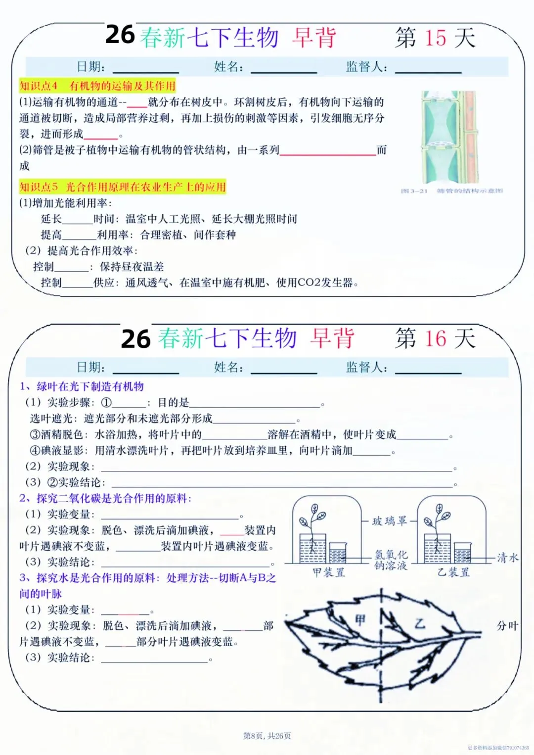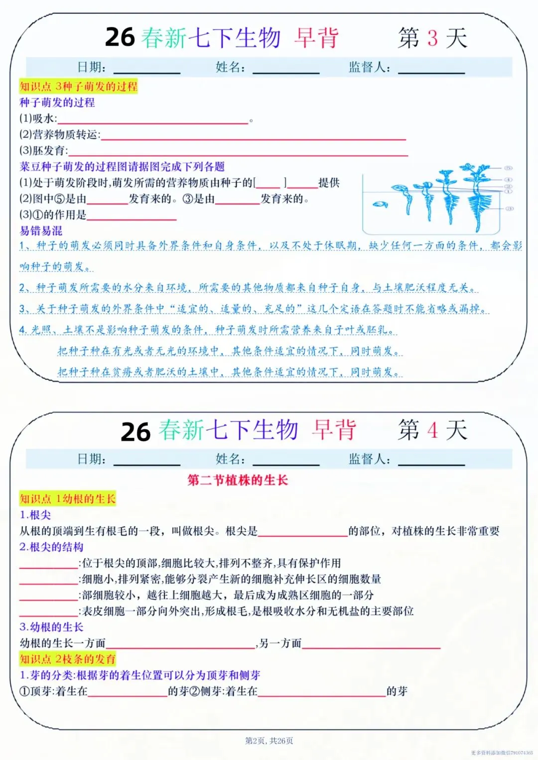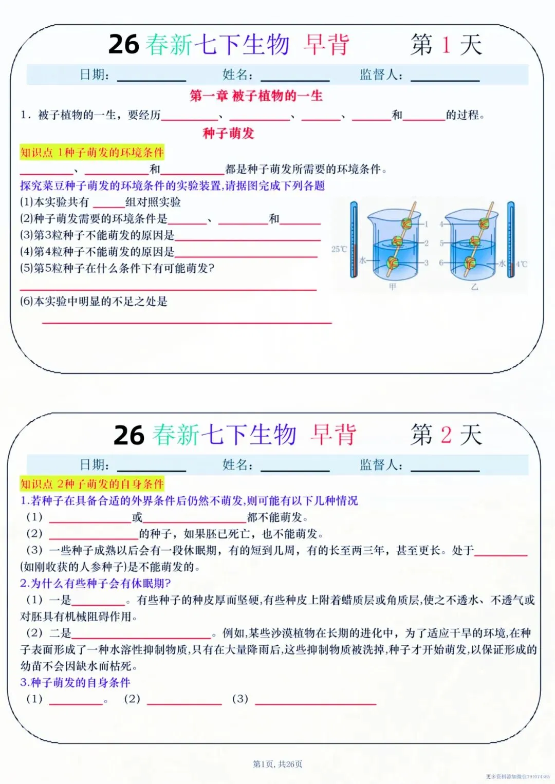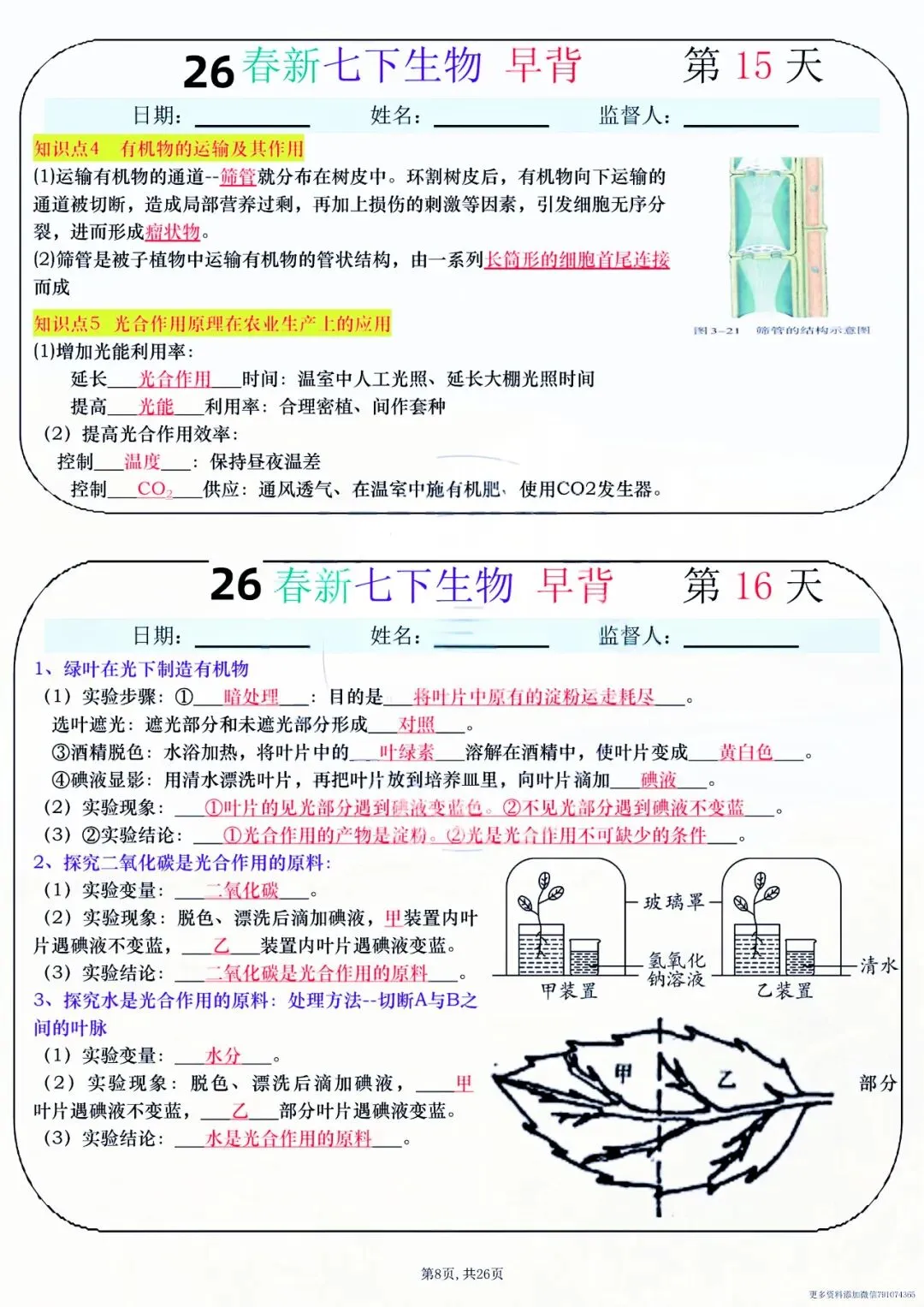 今天老师给大家整理了:七年级下册生物 默写小纸条背诵版 电子版可打印!