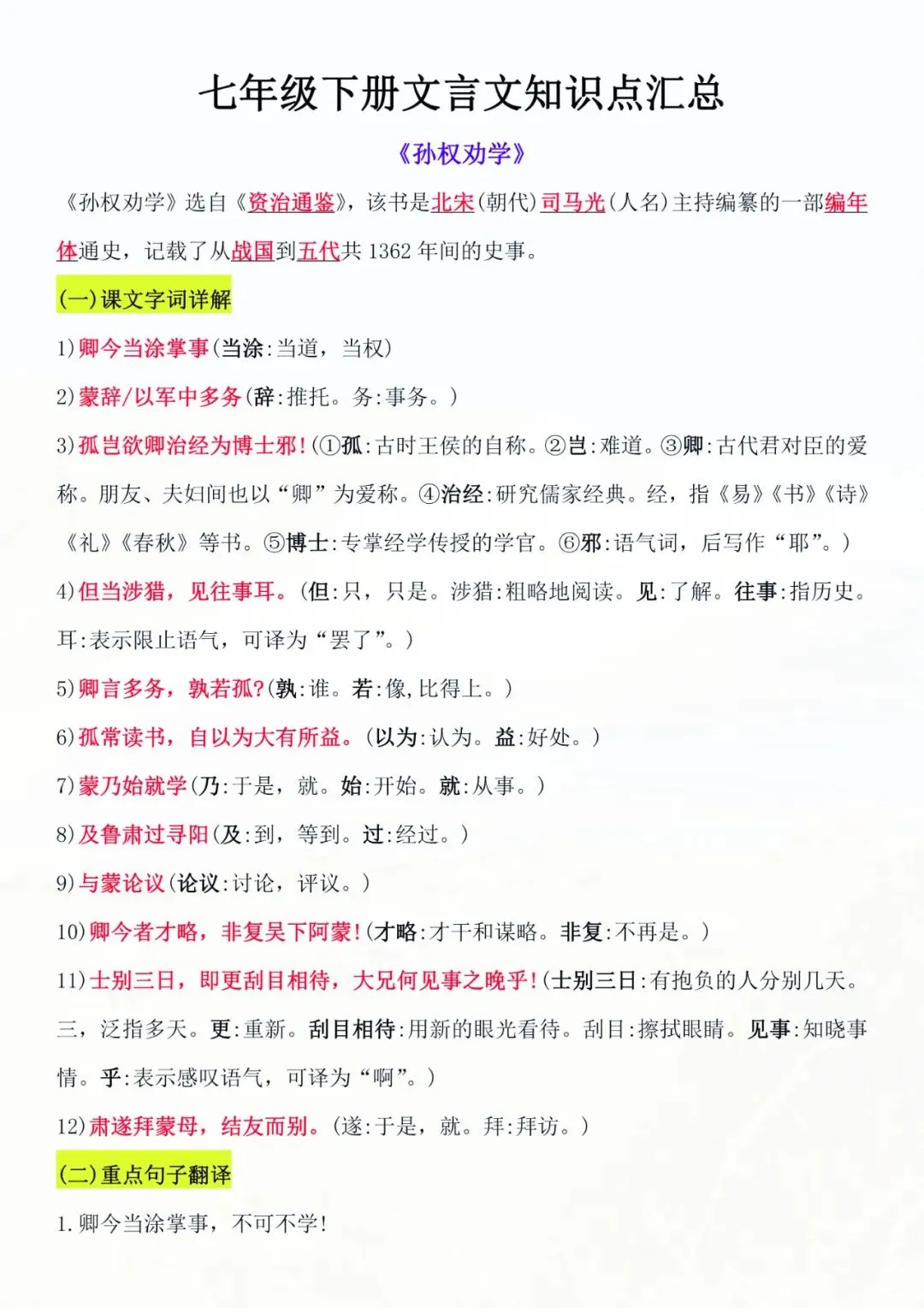 今天老师给大家整理了:七年级下册语文 文言文知识点汇总 电子版可打印!