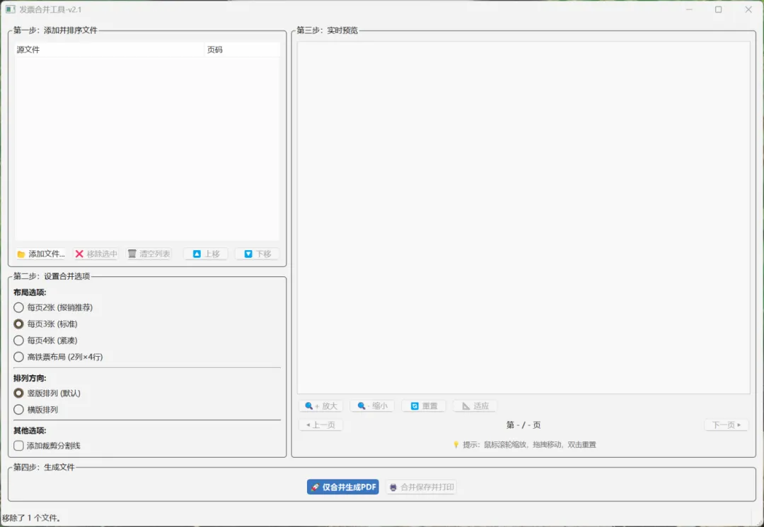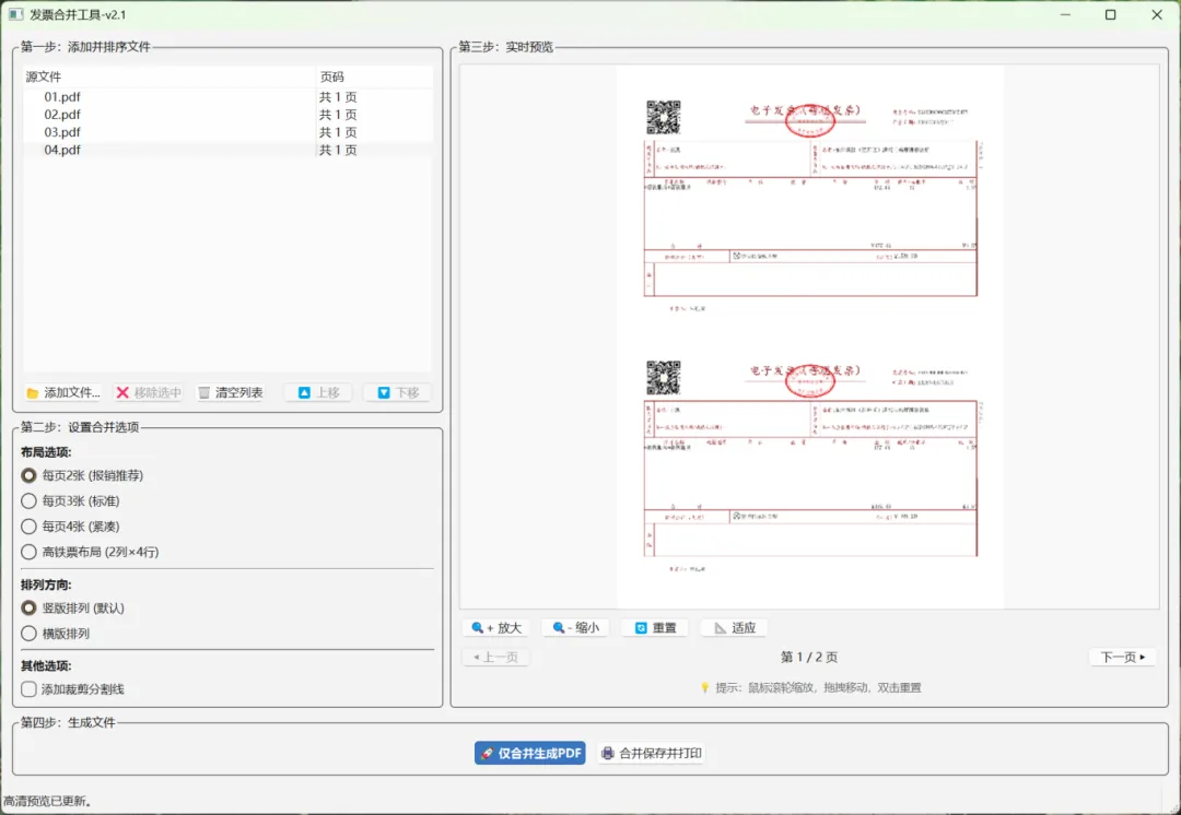 导入发票后,右上角区域可以实时预览合并后的排版效果: