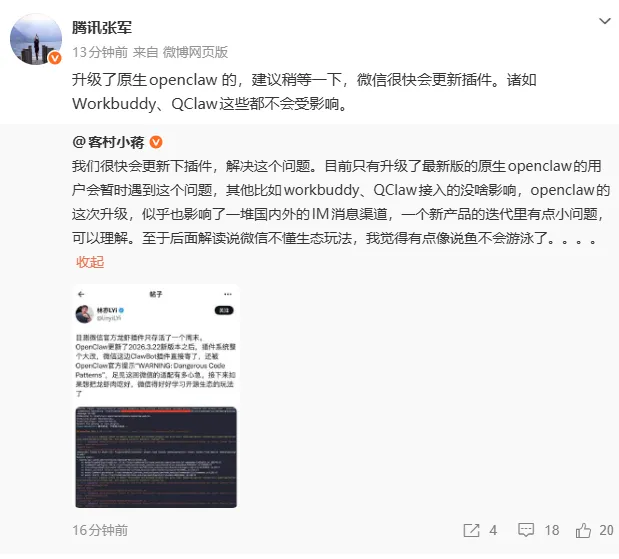3月24日,客村小蒋发文回应网友关于“目测微信官方龙虾插件只存活了一个周末”:“我们很快会更新下插件,解决这个问题。目前只有升级了最新版的原生openclaw的用户会暂时遇到这个问题,其他比如workbuddy、QClaw接入的没啥影响,openclaw的这次升级,似乎也影响了一堆国内外的IM消息渠道,一个新产品的迭代里有点小问题,可以理解。至于后面解读说微信不懂生态玩法,我觉得有点像说鱼不会游泳了。”随后,腾讯张军也回应道:“升级了原生openclaw的,建议稍等一下,微信很快会更新插件。诸如Workbuddy、QClaw这些都不会受影响。”