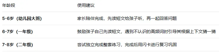通过短文阅读+理解问答的形式,让孩子在真实语境中反复遇见高频词,既巩固了认词能力,又锻炼了阅读理解技巧。适合幼儿园到小学二年级(约5-8岁)的孩子使用。