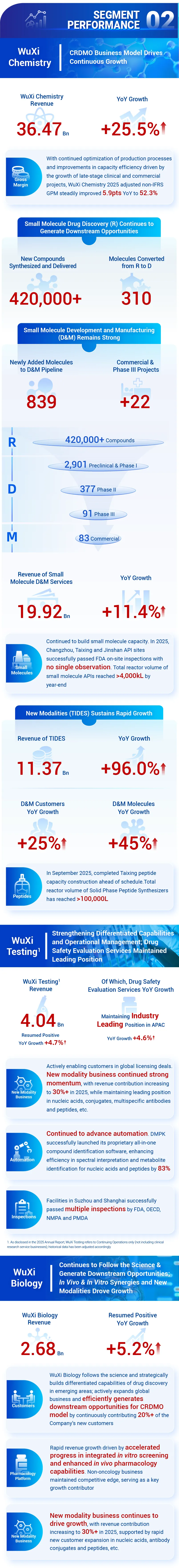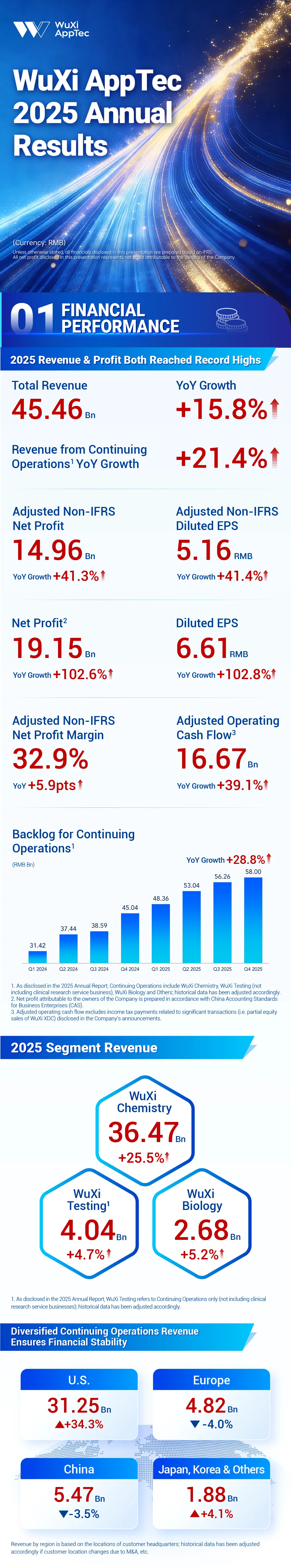 Dr. Ge Li, Chairman and CEO of WuXi AppTec, said, “In 2025, WuXi AppTec achieved record performance with strong growth in revenue, profit and cash flow. Meanwhile, our backlog for Continuing Operations reached RMB 58.0 billion – a 28.8% YoY increase, demonstrating the strength of our unique CRDMO business model and the exceptional execution of our global team.”