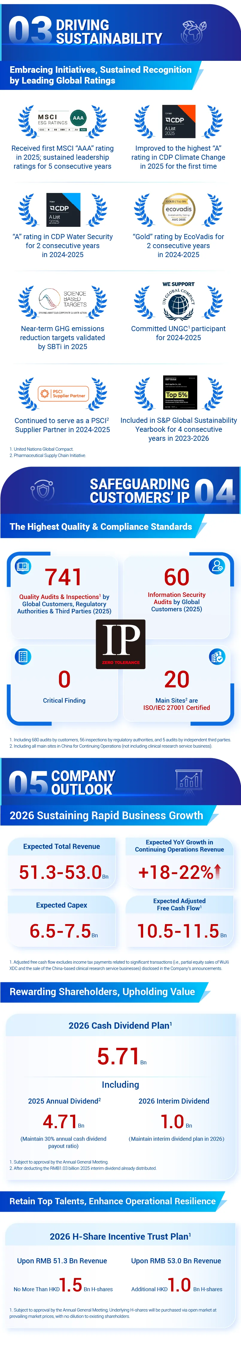 “Entering 2026, with a sharpened focus on our core CRDMO strategy, we are accelerating the growth of our global capabilities and capacity, further improving production and operational efficiency, and delivering greater value for customers and shareholders. For 2026, we expect total revenue to reach RMB 51.3-53.0 billion, reflecting rapid growth of 18-22% YoY in Continuing Operations revenue, and adjusted free cash flow of RMB 10.5-11.5 billion.”