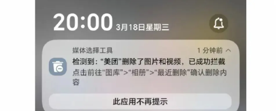 不少网友晒出铁证,手机系统弹窗直接提示: “检测到美团删除了照片/视频,已成功拦截”。