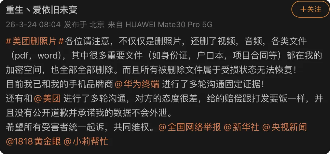 美团APP竟删照片!客服称“第三方插件”冲突,有博主表示“华为工程师分析日志查到的”