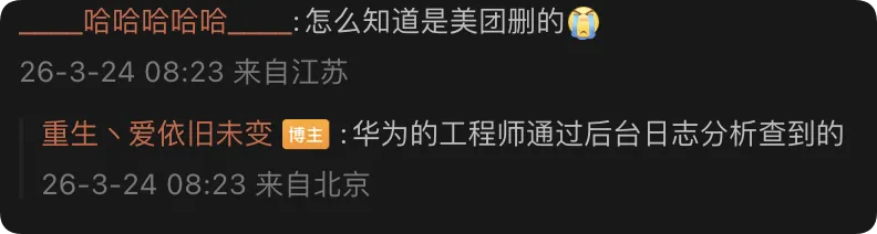 有网友问他是怎么知道是美团 APP 删的,他回应表示“华为工程师分析日志查到的”。
