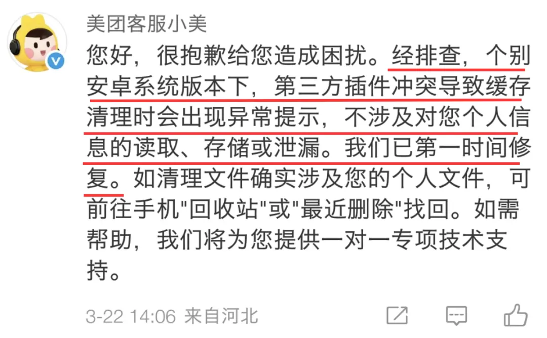 事件发酵后,美团客服账号在 22 号在留言区简单回应,称是个别安卓版本里第三方插件冲突,缓存清理出现异常,不涉及隐私泄露且已修复,建议去回收站恢复。