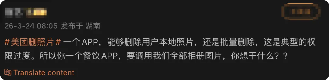 “一个 APP,能够删除用户本地照片,还是批量删除,这是典型的权限过度。所以你一个餐饮 APP,要调用我们全部相册图片,你想干什么”