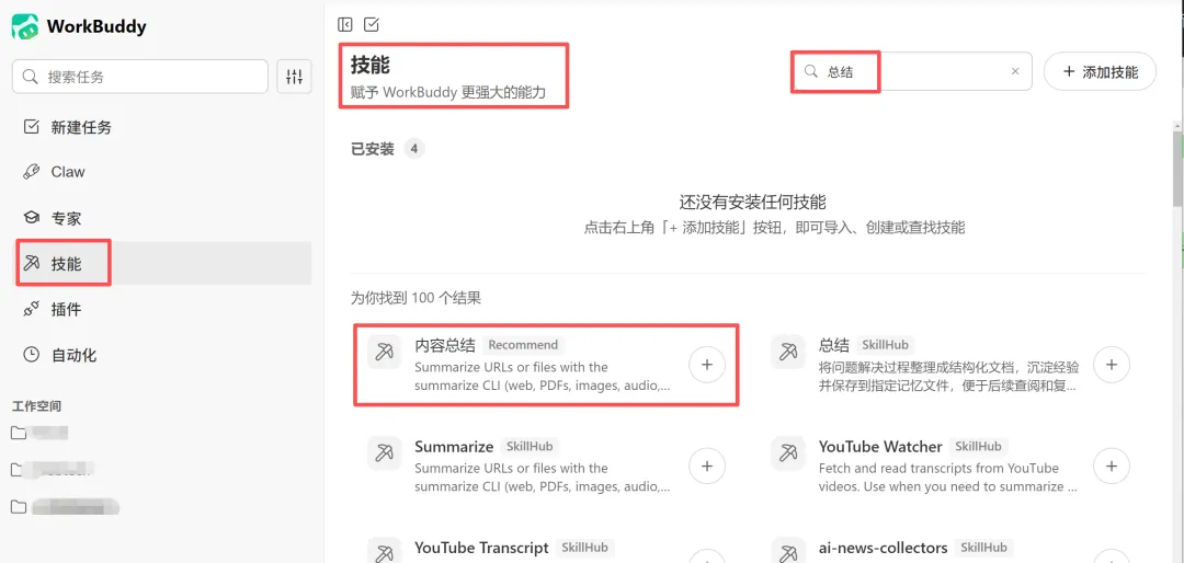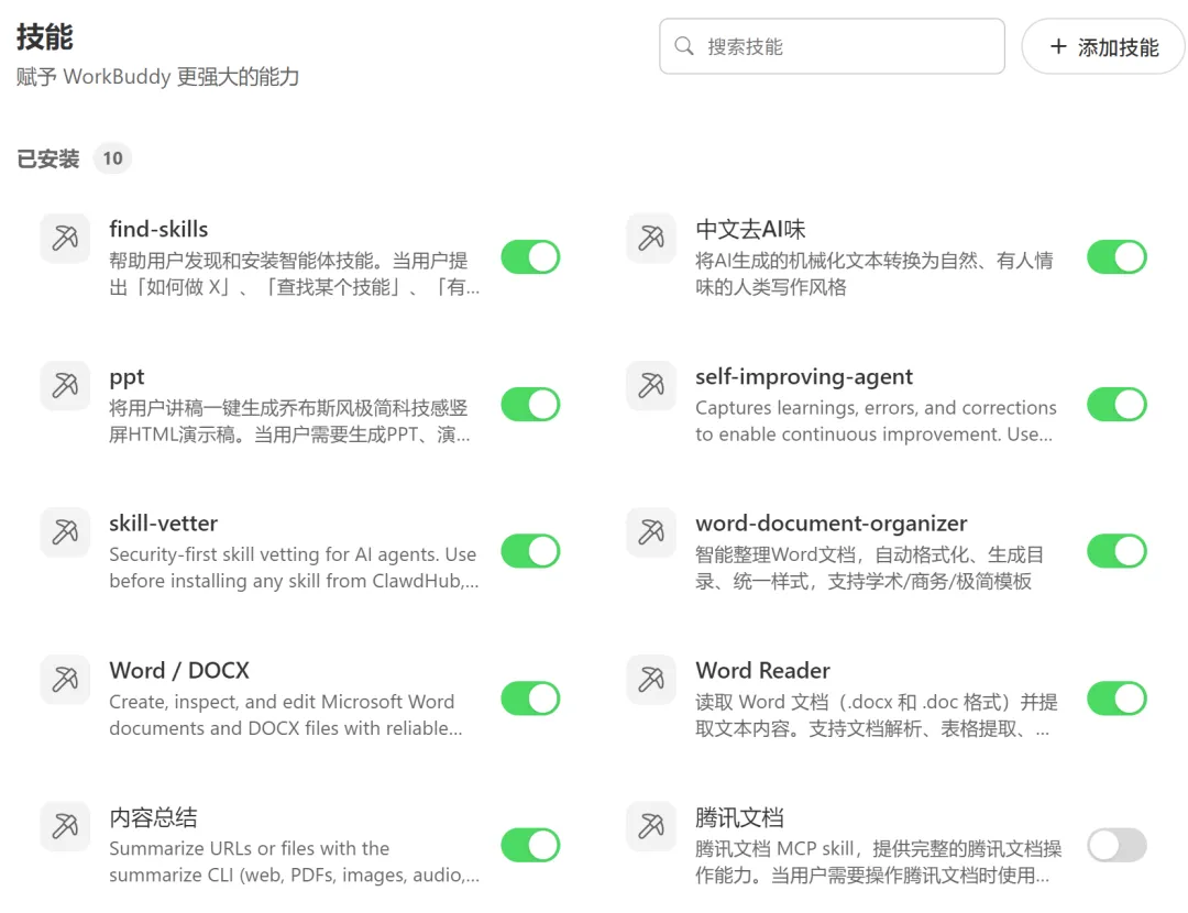 WorkBuddy 左侧导航栏有个”技能”入口,点进去就是技能市场。每个 Skill 有说明页,写了它能做什么、怎么配置。