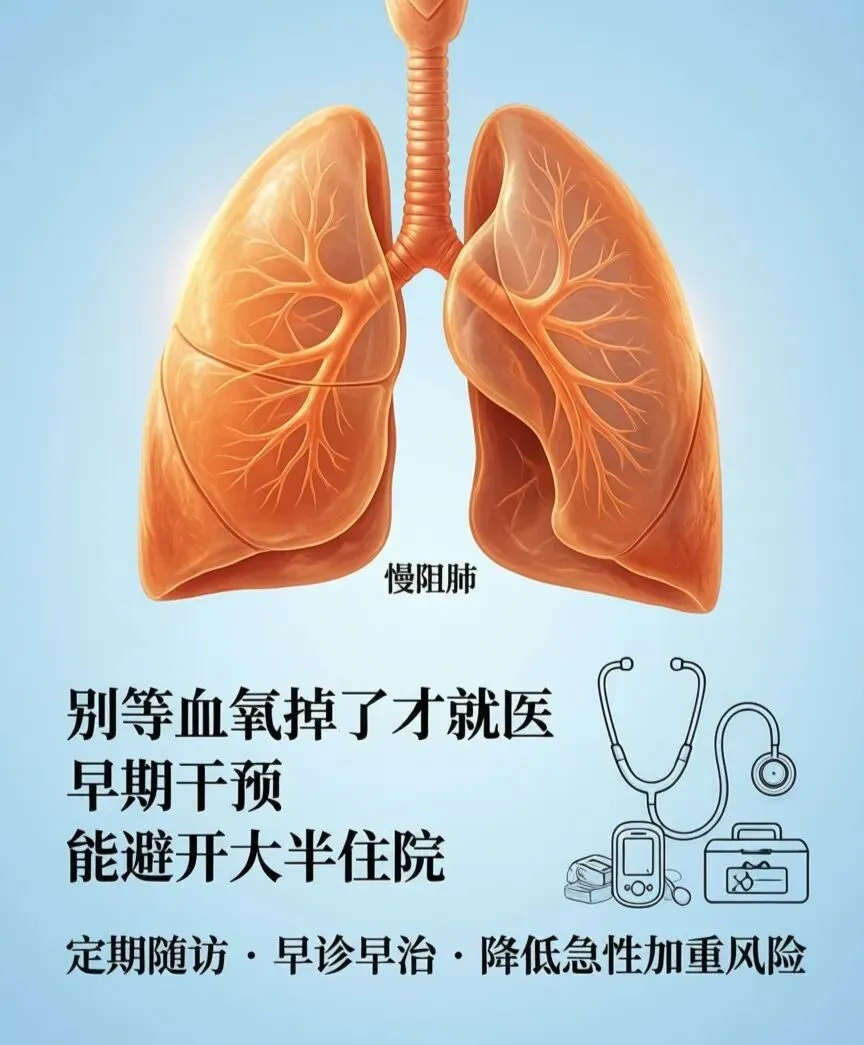 慢阻肺急性加重是渐进性加重的过程,早期血氧饱和度可完全正常,但咳嗽、痰液、喘息、精神状态已出现特征性改变。等到血氧明显下降,往往提示病情已达中重度,大多需要住院甚至呼吸支持治疗。