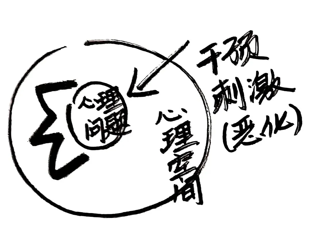 如图所示,本来心理问题占整个心理空间的比例只有这么大,但是在干预和刺激之下,会对其进行强化。