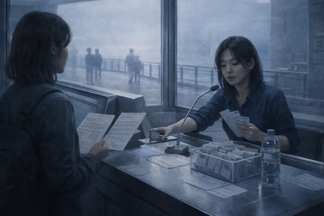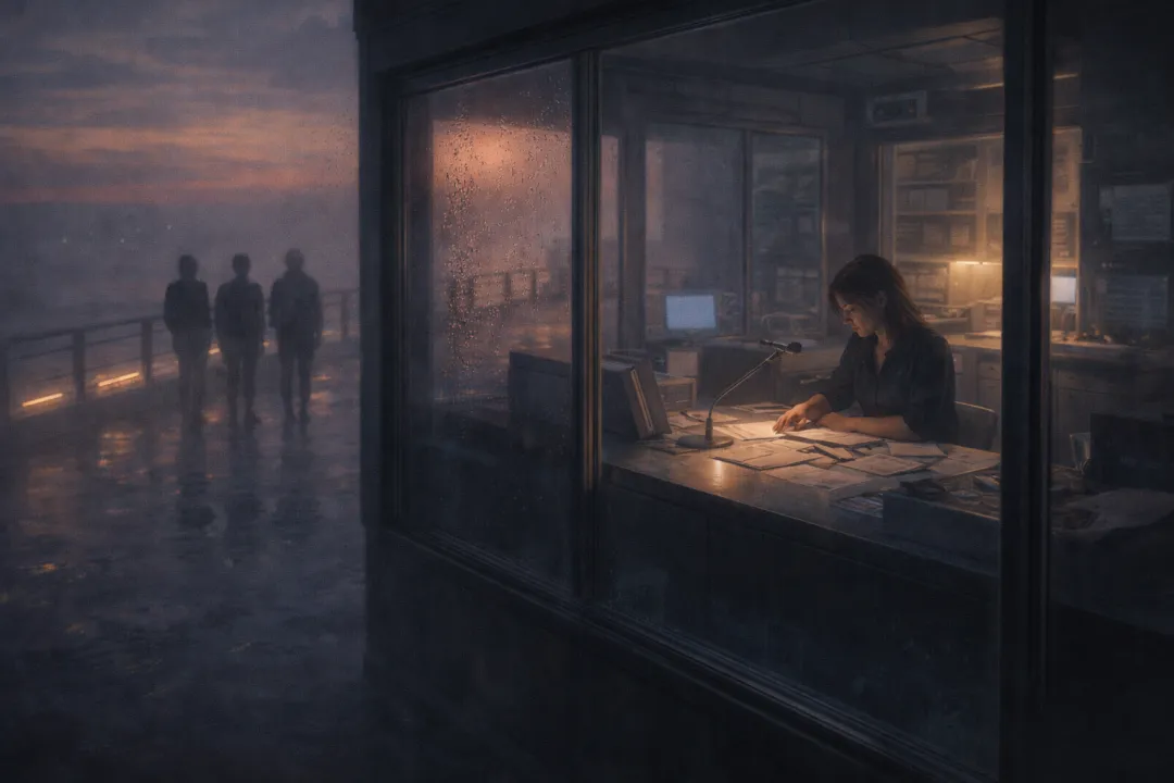 镜岸站临时解释窗口开在旧展厅最外侧,靠近风口,隔着一层玻璃就能看见临海步道。玻璃前总有人停下来往里看,问的却不是展窗里那些还挂着的示意图,而是更眼前的事:沿海学校今天会不会停接待课;晚班接驳车会不会改线;家里老人昨晚说听见有人在后门跟他说话,要不要先报社区。窗口桌面上摆着一只透明收纳盒,里面插满回收单和手写条。负责值班的女工作人员声音已经有点哑,念到第三遍“暂不建议自行扩写观察感受”时,眼睛都没抬,只下意识去找桌角那瓶早凉了的水。