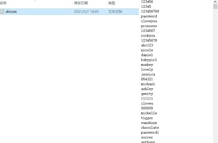 字典破解方式需要将可能是密码的信息写入dict.txt文本文档里面。