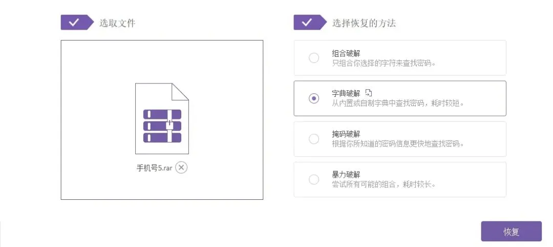 打开压缩包密码恢复工具,选择需要恢复密码的压缩包文件,然后选择恢复方式。