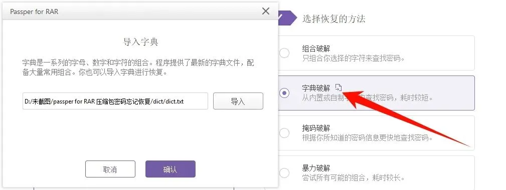 这里我选择字典破解方式,会弹出导入字典窗口,将完善好的字典文本文档添加进来,点击确认。