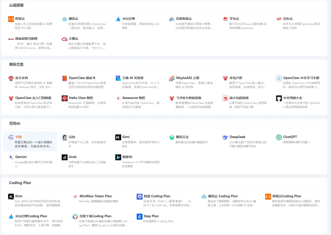 这个导航站的内容设计非常贴心,涵盖了使用 OpenClaw 的方方面面: