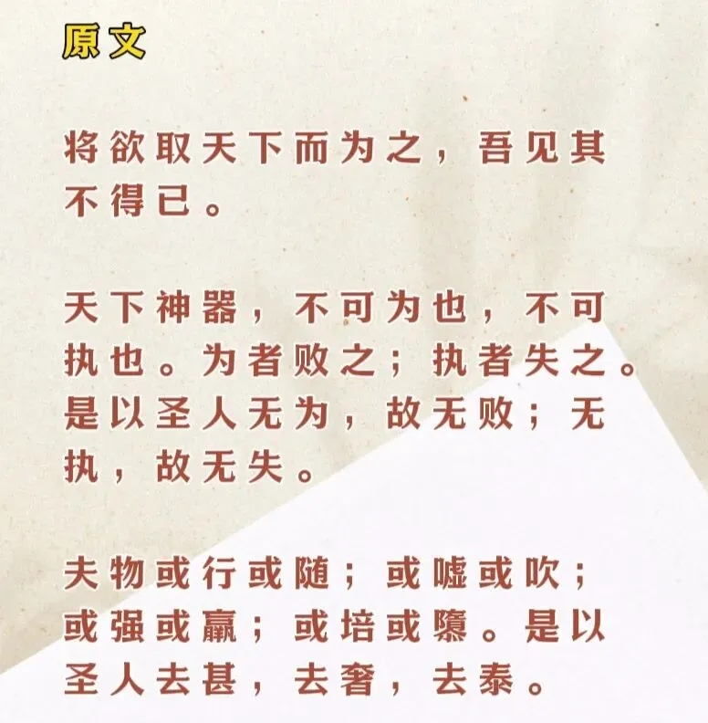 天下是神圣器物的组合体,不可强行作为,也不可强行执掌。勉强作为的人会失败;强行执掌的人也会失去。因此,有智慧的人不强行作为,所以他不会失败;不强行掌控,所以他不会失去。