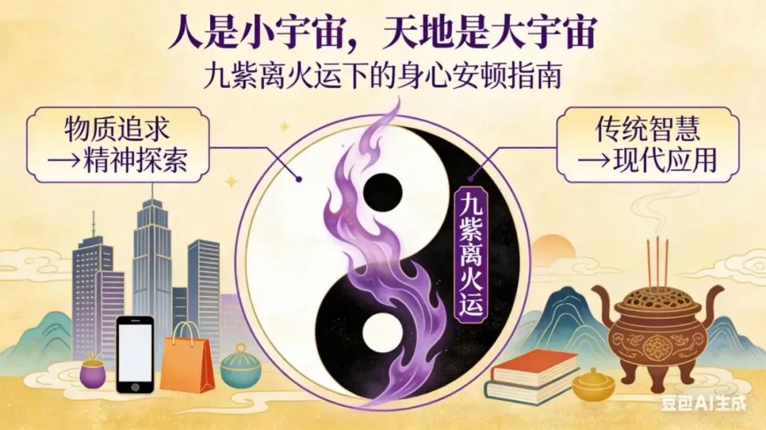 本篇内容源于对中国古代哲学与养生智慧的整理与学习,旨在探讨如何在现代生活中,通过传统文化的视角来理解和安顿身心。文中提及的“九紫离火运”是传统术数文化中的一种时间观念,我们将其作为一种理解时代背景的文化视角;而“能量”、“调频”等词汇,更多是指代人的“身心状态”、“内在力量”与“心性修养”。