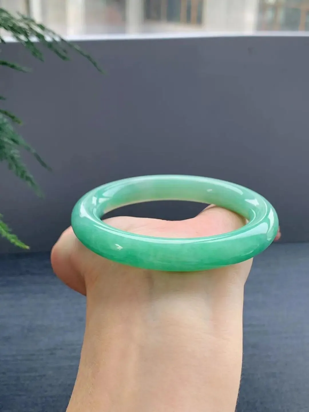 圈口58的圆条手镯,鲜嫩果绿如春日新芽,通透干净,水头充足。温润底子细腻起胶,果绿清新均匀,阳光下清透显白。圆条饱满厚实,条杆顺滑,上手温婉大气,贴肤舒适,附权威证书。