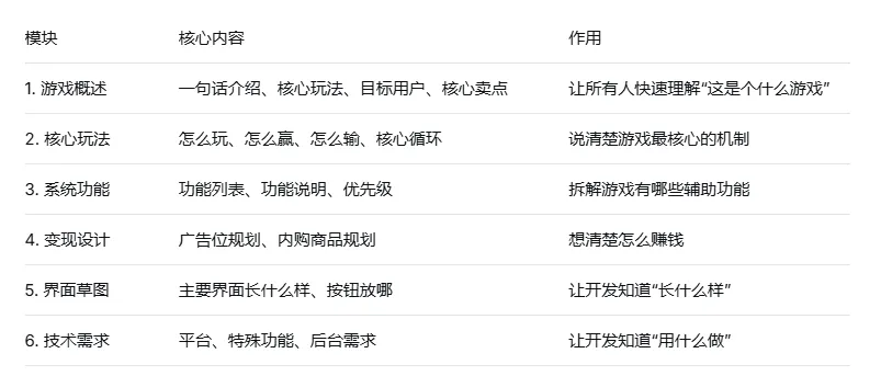 把游戏拆成一个个功能模块,列出来。开发拿到这个表格,就知道要做什么、先做什么。