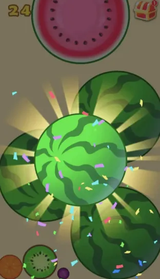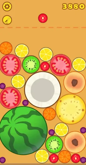 4. 两个相同的水果碰到一起,合成为更高级的水果(樱桃→草莓→橘子→柠檬→猕猴桃→番茄→桃子→菠萝→哈密瓜→西瓜)