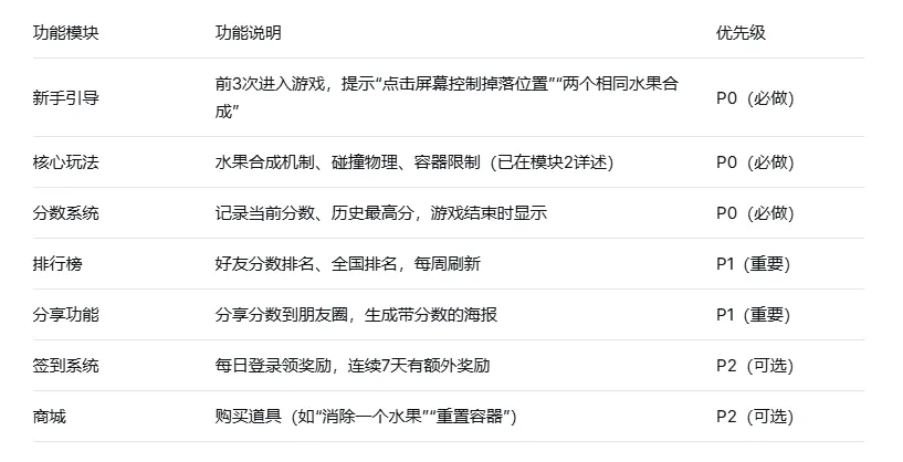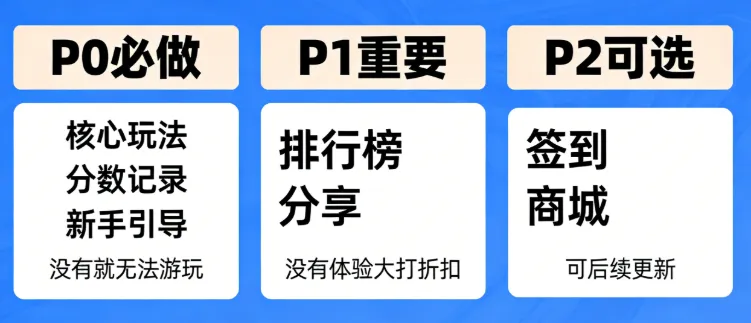 1) P0(必做):没有这个功能,游戏没法玩。核心玩法、分数记录、新手引导。第一版必须上。