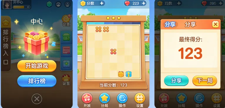 3) 结算界面:游戏结束后的样子(得分显示、分享按钮、下一局)