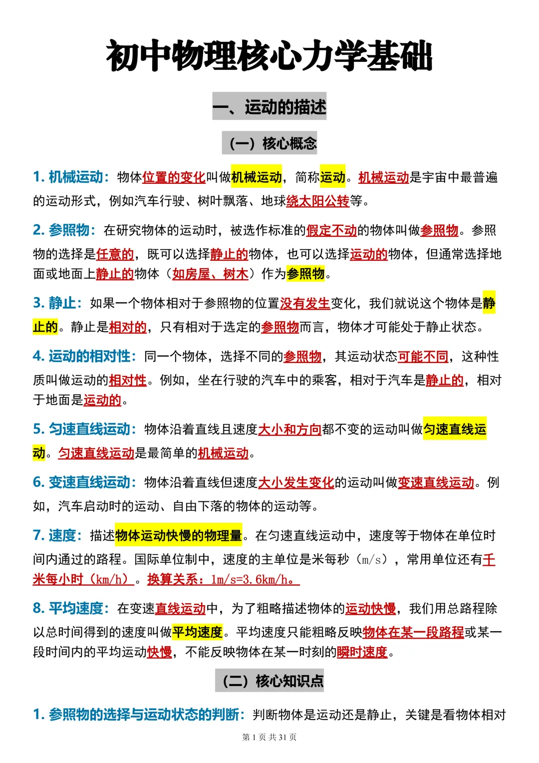 今天给大家整理了中考必备的【初中物理核心力学基础】,覆盖概念、计算、物理运用等全场景常考话题,附详细解析与技巧,不管题目如何变式,都能精准应对,轻松拿下高分!