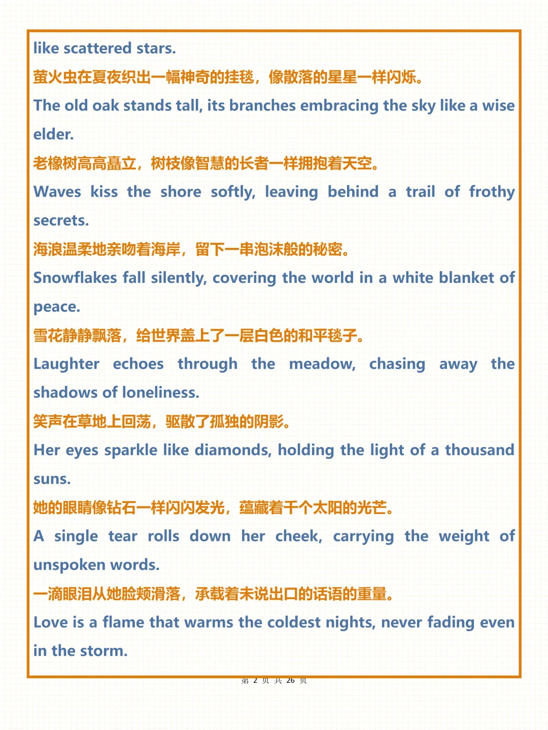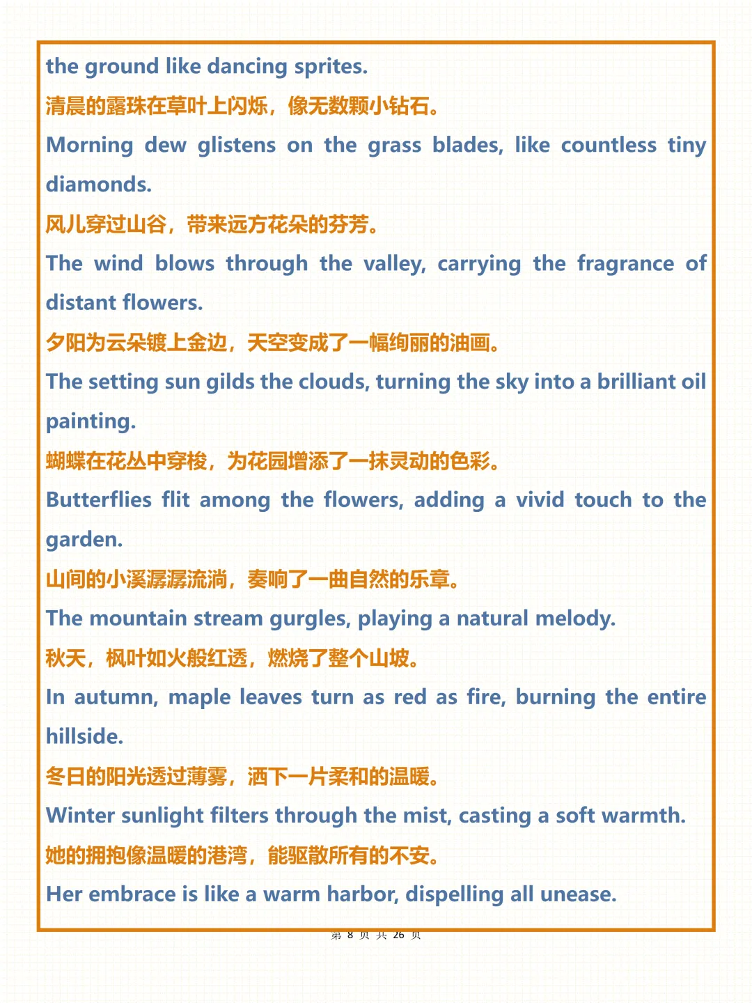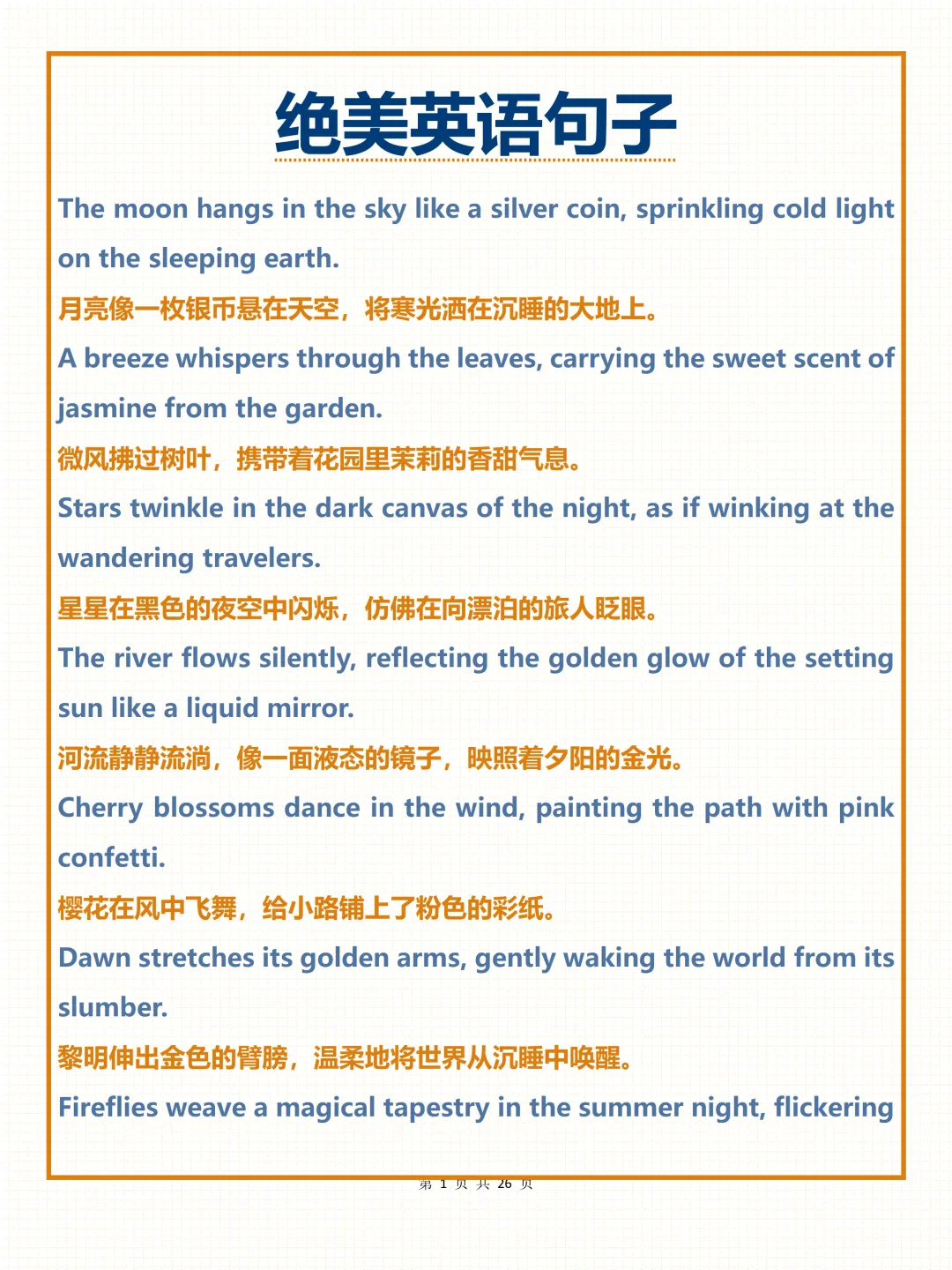 今天给大家整理了中考必备的【绝美英语句子】,覆盖美丽的自然现象、感情抒发、哲理名句等全场景常考话题,附详细表述与中文翻译,不管题目如何变式,都能精准应对,轻松拿下高分!