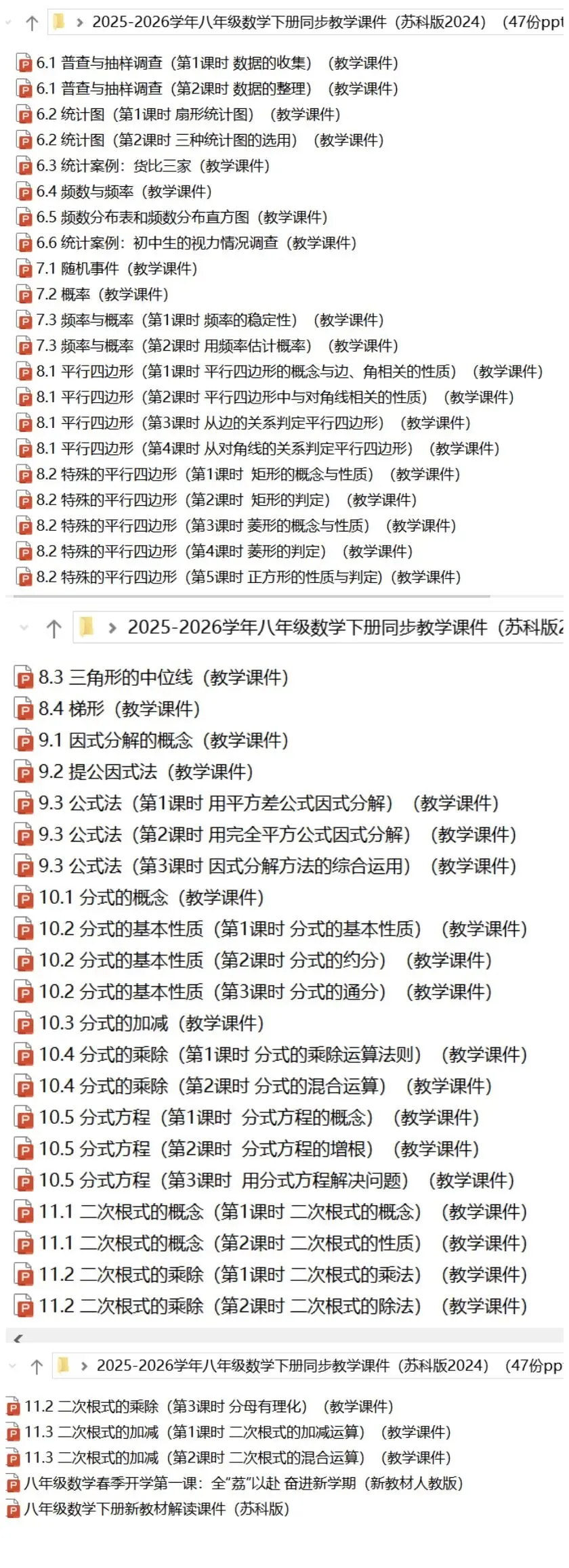 2026年八下数学苏科版:同步教学课件47份ppt | 完整电子版文档可下载 👉 点击进入八下数学苏科版合集【持续更新中……】 2025-2026学年 八下数学苏科版 同步教学课件 47份ppt 完整电子版文档可下载 无水印、可编辑、可修改 完整版目录及部分内容截图如下 下载方式见文末 以下公众号👇 专注高中优质学习资料 欢迎点击关注 获取更多学习资源