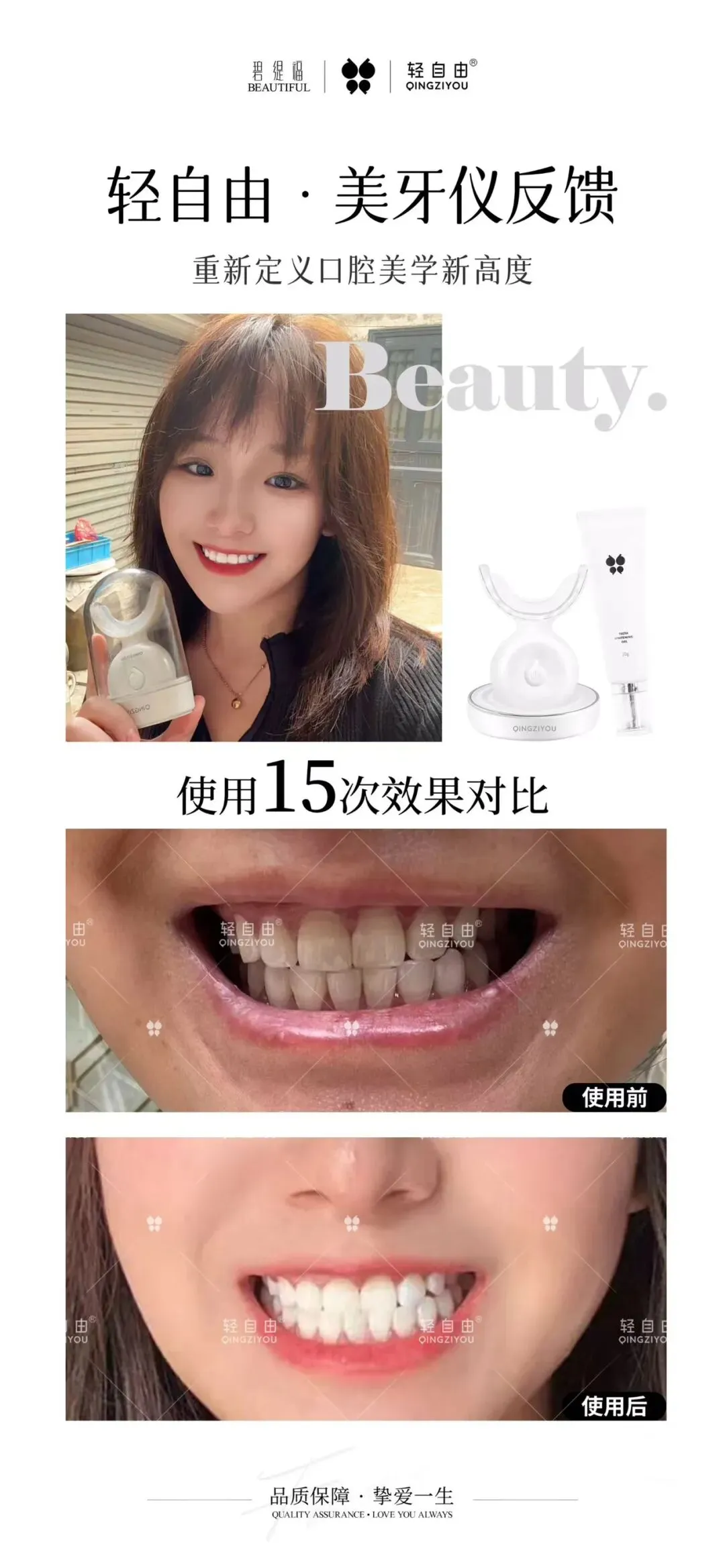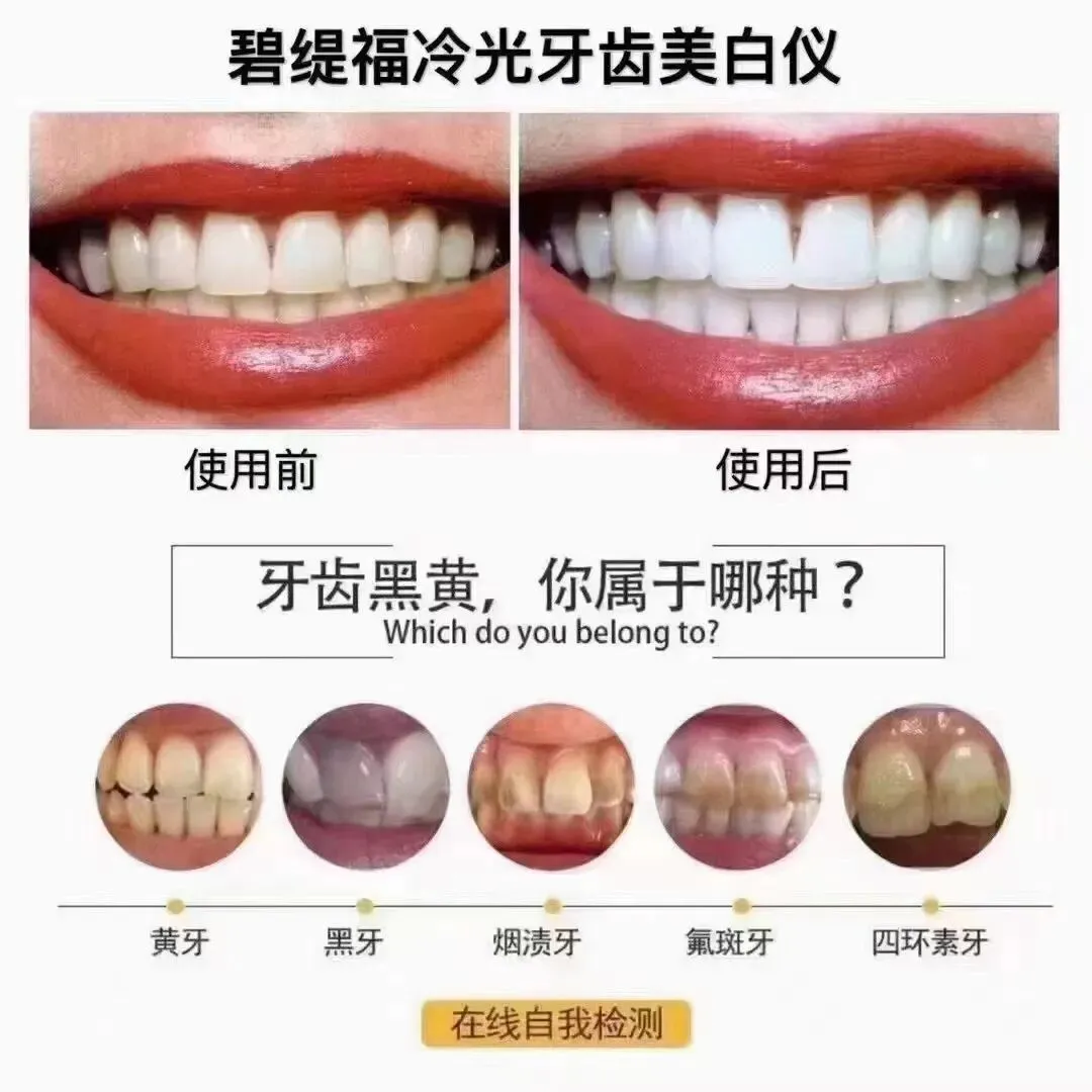 2.《冷光牙齿美白仪》拥有国家专利, 欧盟ECM机构认证。采用低温蓝光,光纤传导,结合特效美白凝露,快速产生氧化反应,透过釉质,牙小管,使牙齿表面的色素淡化祛除来美白牙齿。是中国牙齿美白行业第一的品牌,销量无人可超越。选用冷光牙齿美白仪,让它保护、呵护你的牙齿,让你拥有一口健康大白牙。