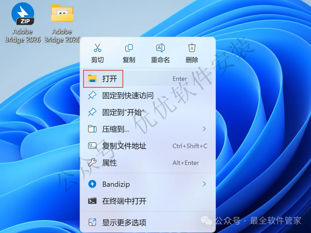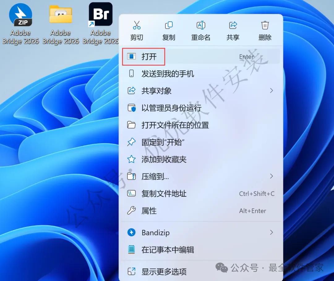 8、右键桌面上的【Adobe Bridge 2026软件图标】,点击【打开】