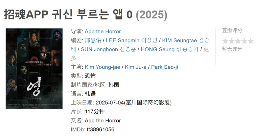 2025年7月4日,韩国恐怖片《招魂APP》在富川国际奇幻影展首映,这部由导演App the Horror执导、邢瑟佑等五位编剧联合创作的117分钟惊悚力作,以颠覆性的科技恐怖设定引发全球关注。作为恐怖短篇合集《解锁》的开篇之作,该片不仅刷新了韩国恐怖电影的技术边界,更以多个短篇故事的叙事结构重构了现代恐怖片的创作范式。