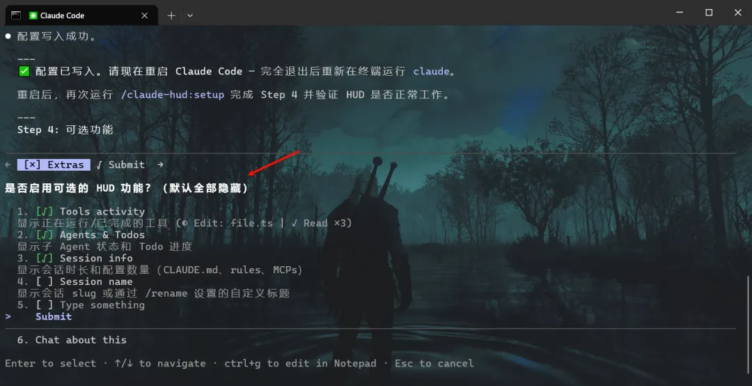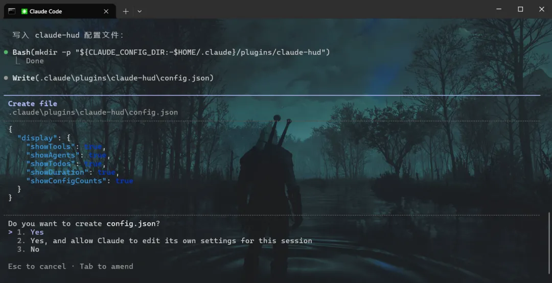 按照上面选择自己需要的功能后,然后Claude Code 会帮你在.claude\plugins\claude-hud\config.json 文件中写入相关配置信息。