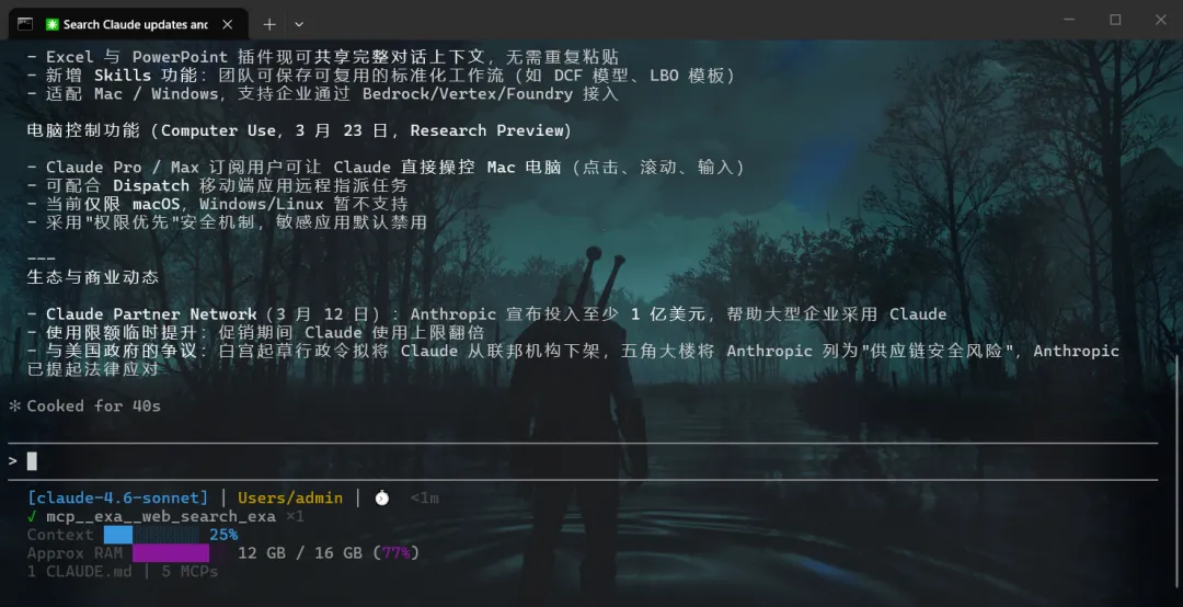 不需要额外窗口,不需要 tmux,任何终端直接用。