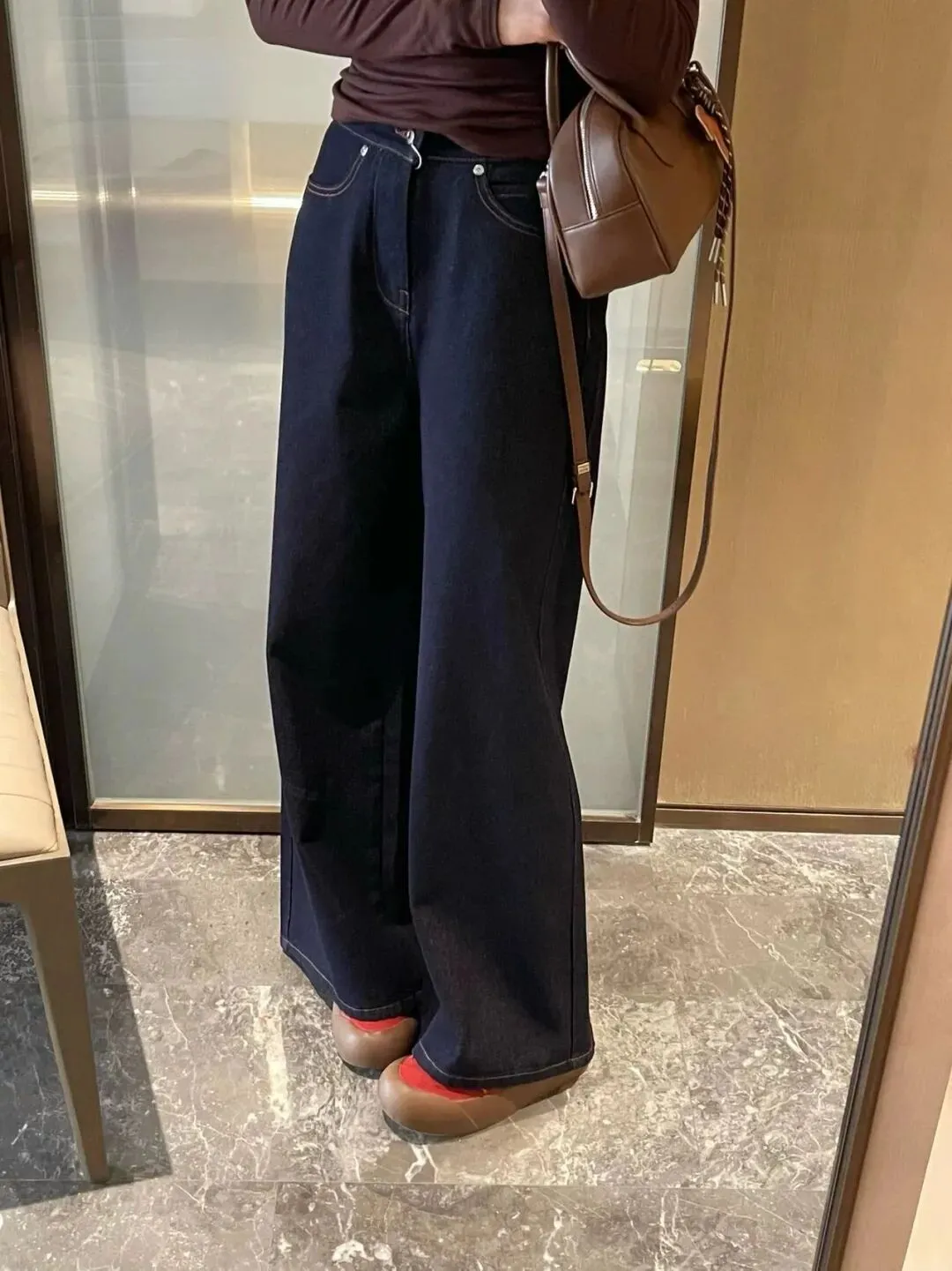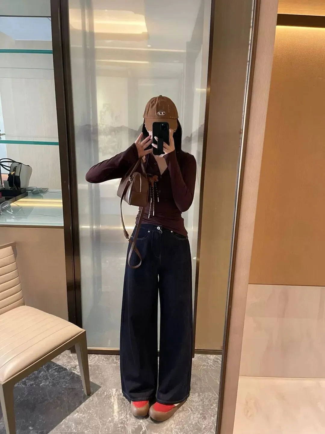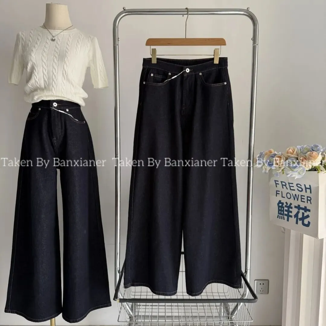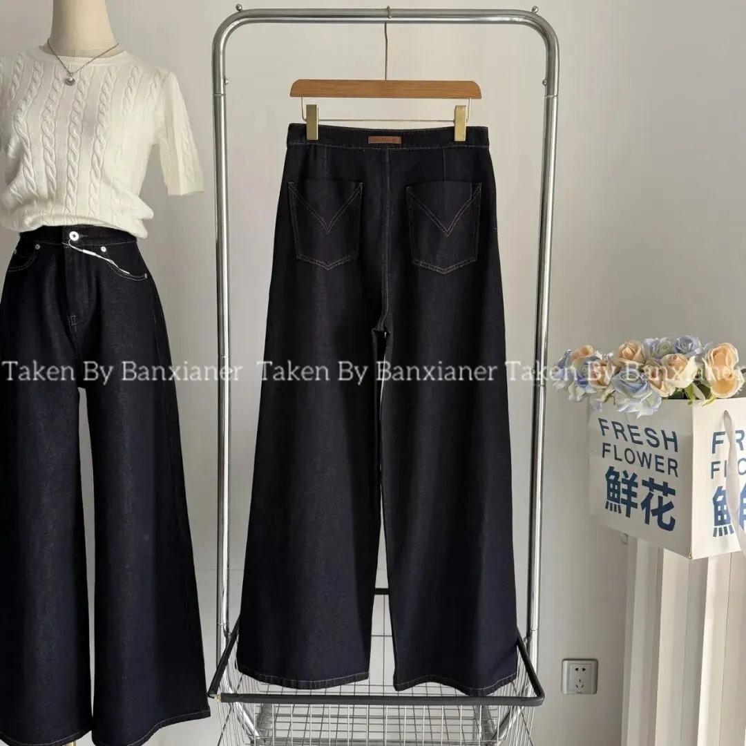 裤型超好~复古松弛感时髦高腰显瘦垂感大阔腿裤拖地裤长裤牛仔裤女售价95米裤型敲好的牛仔裤!高含棉的斜纹牛仔面料挺括有型,基本无弹高腰的设计刚好卡在腰线醉细的地方大阔腿裤型垂感满分把腿修饰得又直又长,很遮肉!撞色明线和 V 型后袋的设计,复古感拉满金属铆钉和后腰皮标,细节做得超扎实日常穿不卡裆不勒腰,通勤休闲都适配好穿又耐看,上身美式复古的慵懒感!真的很难不爱!