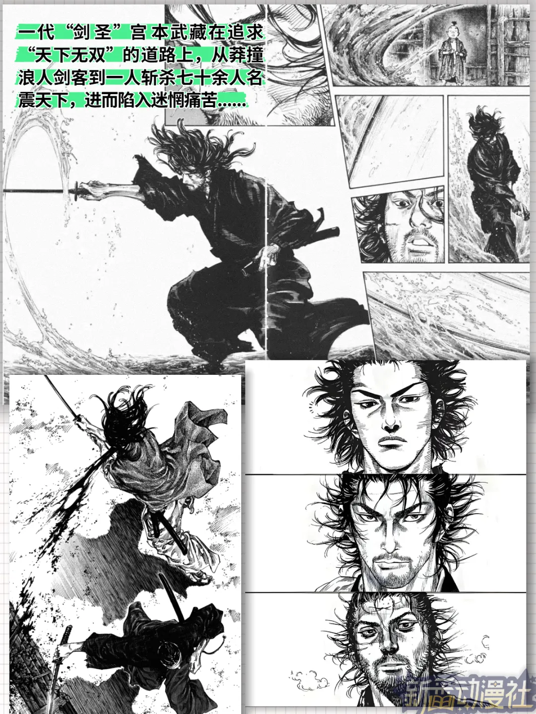 井上创意性地将中国风山水水墨画与日本商业漫画相融合,分镜技巧堪称神仙。