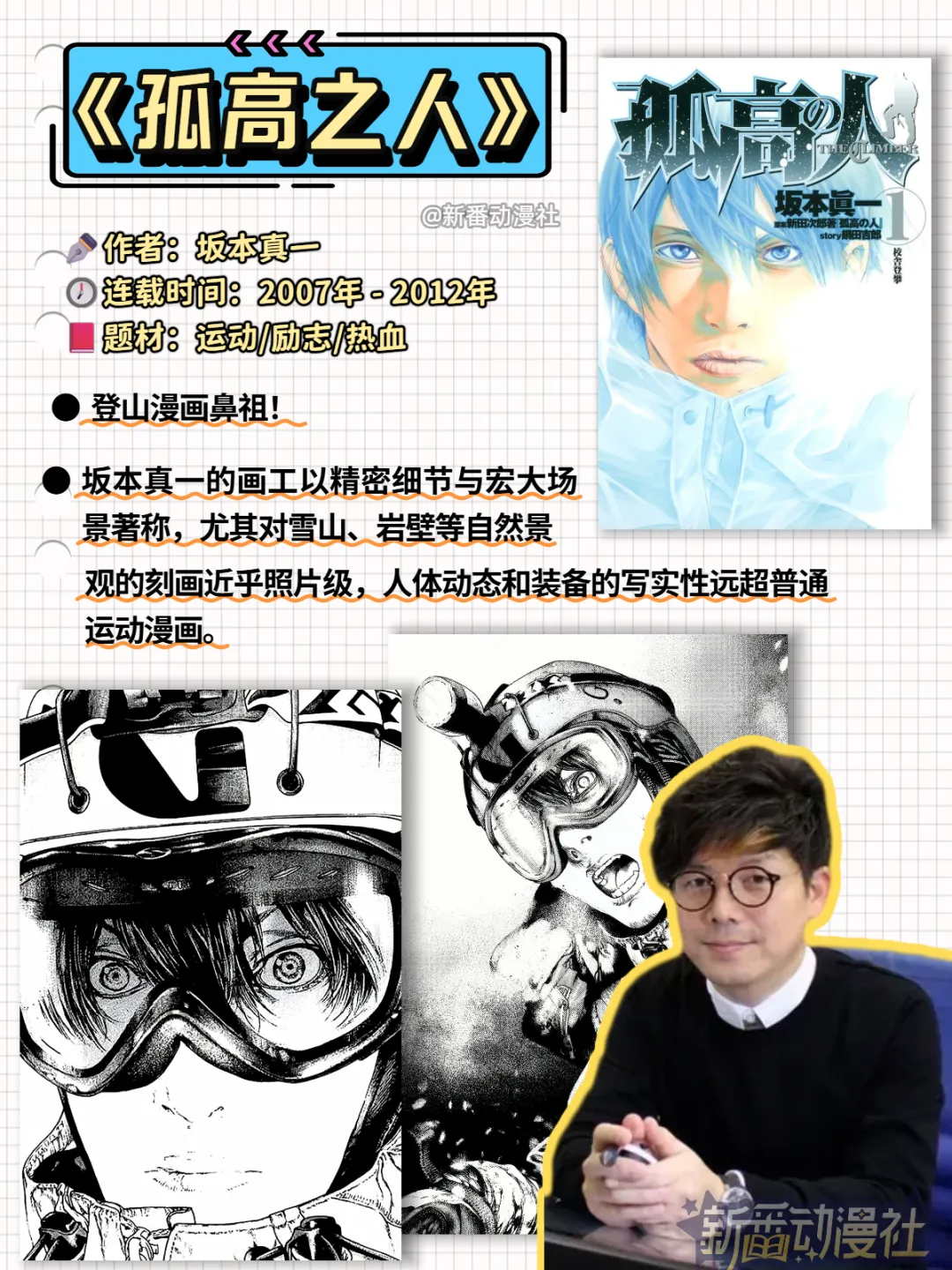 坂本真一的画工以精密细节与宏大场景著称,尤其对雪山、岩壁等自然景观的刻画近乎照片级,人体动态和装备的写实性远超普通运动漫画。