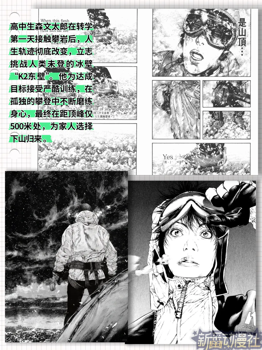 高中生森文太郎在转学第一天接触攀岩后,人生轨迹彻底改变,立志挑战人类未登的冰壁“K2东壁”。他为达成目标接受严酷训练,在孤独的攀登中不断磨练身心,最终在距顶峰仅500米处,为家人选择下山归来 。