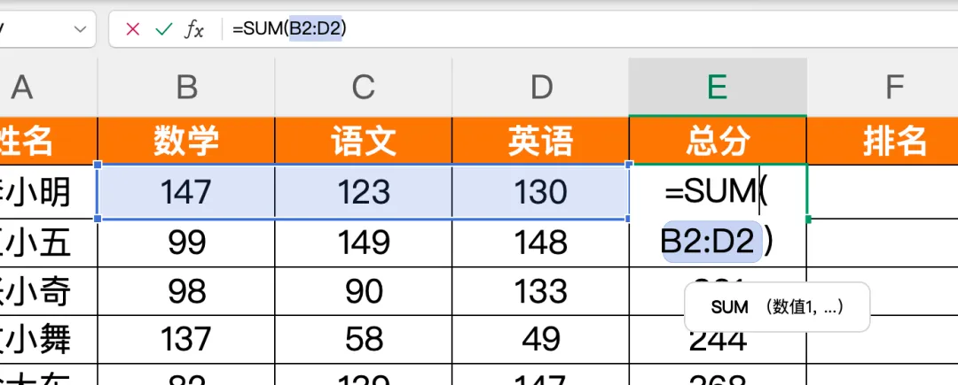 选中第一位学生“总分” 列对应的单元格(如 E2),再框选该学生的所有单科成绩单元格(如 B2:D2),按下快捷键Alt+=,Excel 会自动生成求和公式,瞬间算出该学生的总成绩,全程不用手动输入函数。