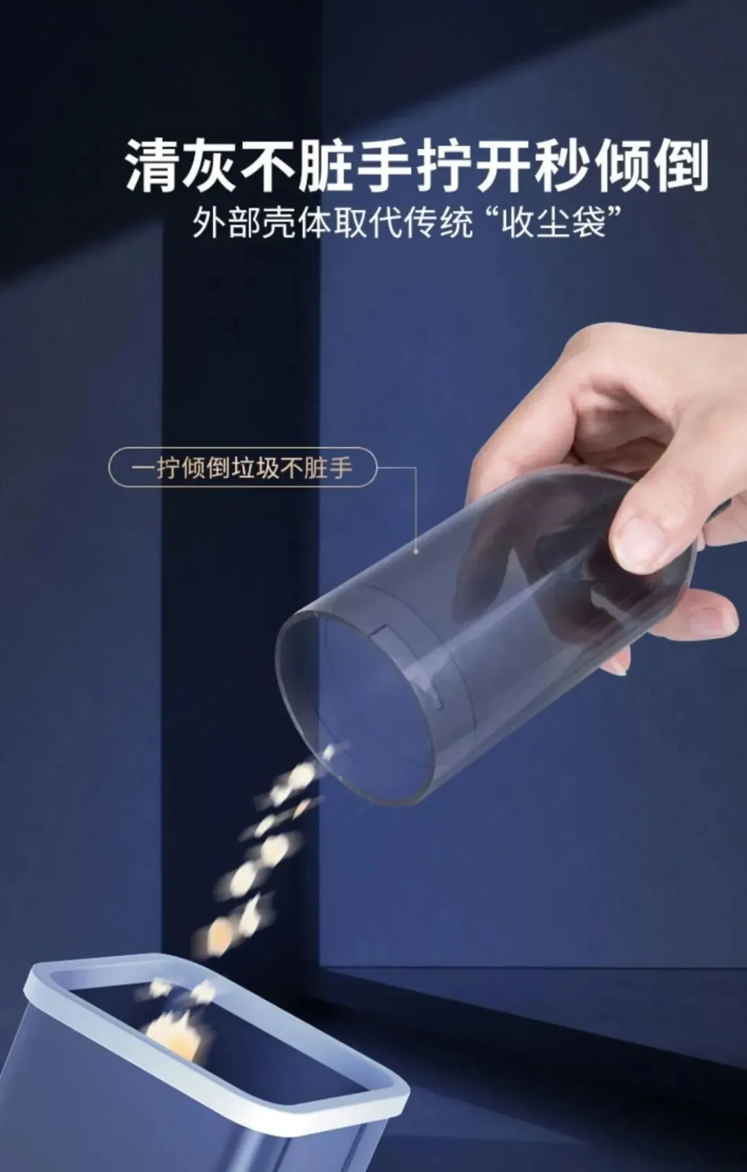 清洁完毕后,打开机盖即可倾倒掉垃圾,比用扫帚、鸡毛掸子清洁方便多了。