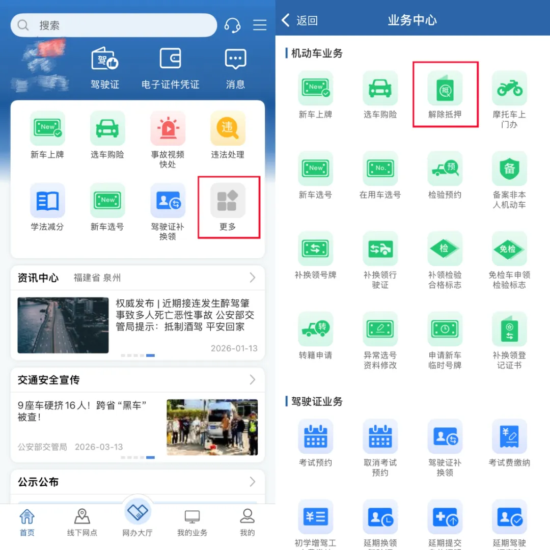 点击首页【业务待办】或【业务中心】,点击【解除抵押】进行确认;