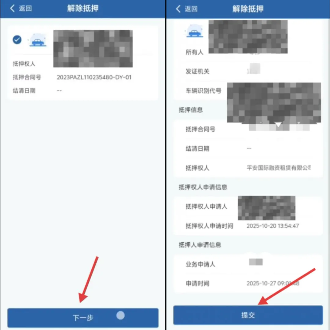 勾选需要解除抵押的机动车,点击【下一步】,确认解除抵押登记信息无误后,点击【提交】;