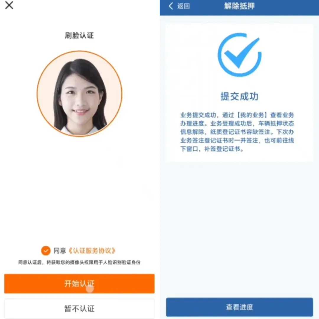 按照系统提示进行人脸认证,认证通过后点击【提交】,页面显示“提交成功”就搞定啦!可通过【我的业务】查看业务办理进度。