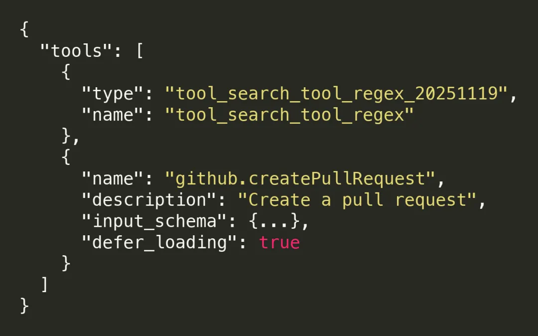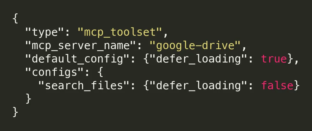 只需在工具定义中添加 defer_loading: true 标记: